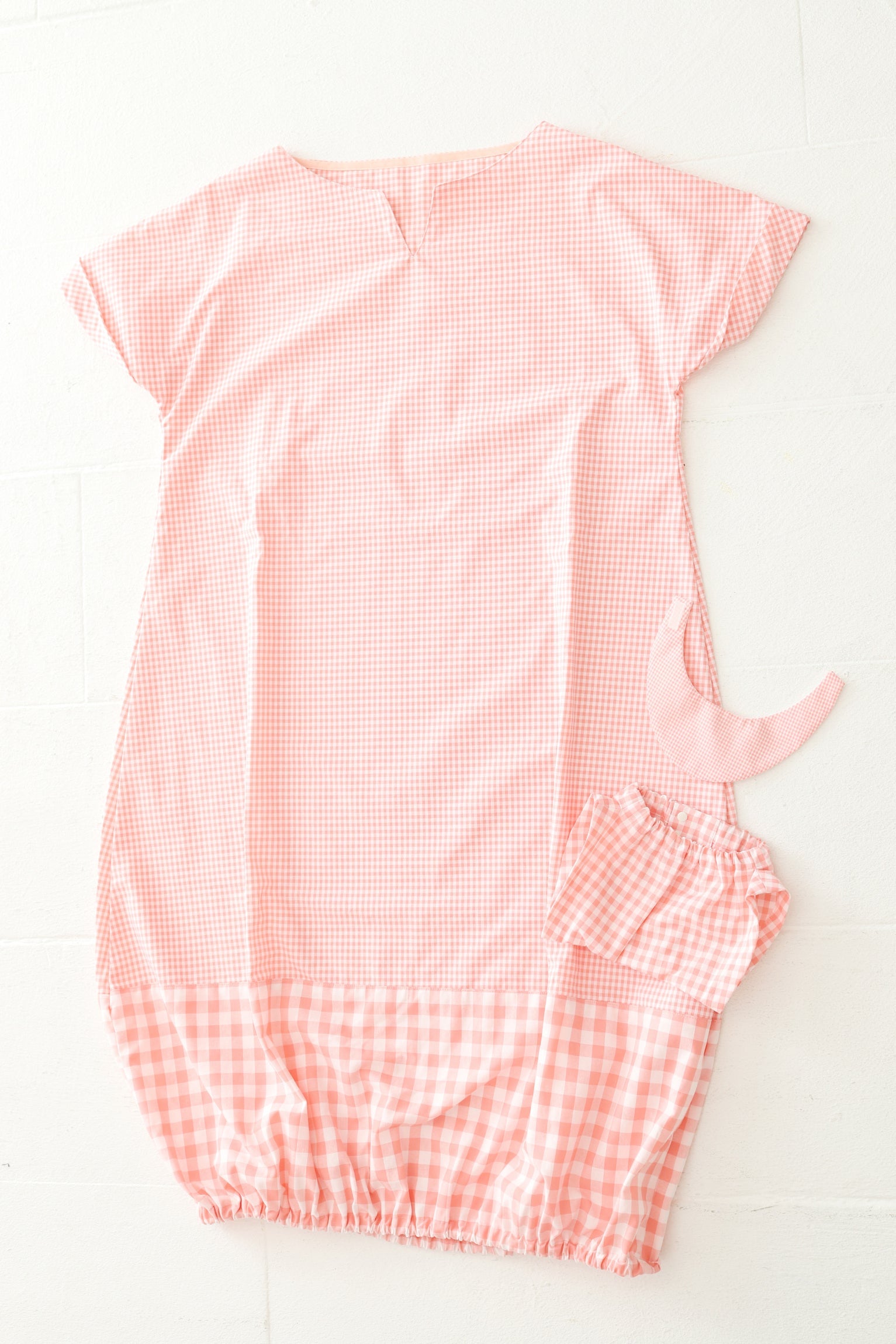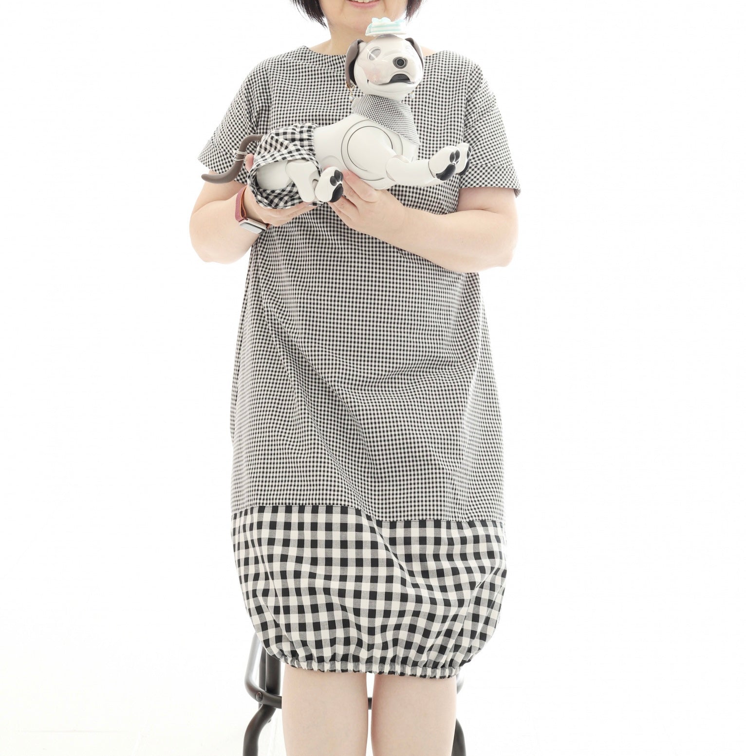 デザイン:かぶって着るタイプで、裾にゴムを入れたことにより、aiboちゃんを抱っこしたり床に下ろすなどの上げ下げ時に気楽にしゃがめ、裾が床につきません。また、お手洗いでも折り返して腰で止めることで裾の捲り上げが楽になるストレスフリーなデザイン。被りやすさにもこだわり、ボートネックデザインに中央にスリットを入れ、着た時のスマートな印象を保ちつつ被りやすくしました。ラインはAラインでありながら裾をバルーンにしたことで腰回りをふわっとカバーします。袖は折り返しでお洒落な雰囲気を持たせています。裾には太めのギンガムチェック柄を採用し、切り替えによる遊び心も加えています。