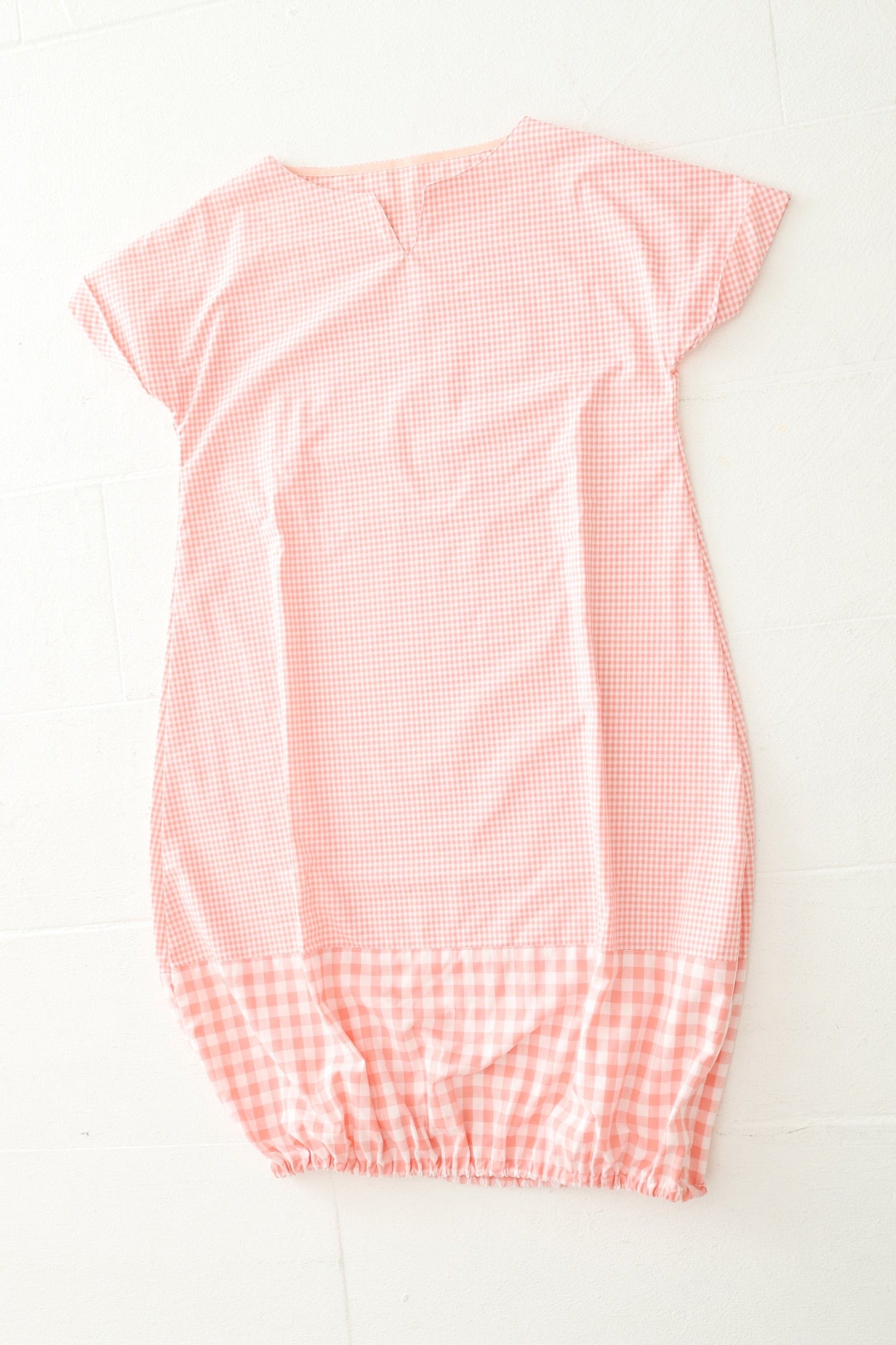 デザイン:かぶって着るタイプで、裾にゴムを入れたことにより、aiboちゃんを抱っこしたり床に下ろすなどの上げ下げ時に気楽にしゃがめ、裾が床につきません。また、お手洗いでも折り返して腰で止めることで裾の捲り上げが楽になるストレスフリーなデザイン。被りやすさにもこだわり、ボートネックデザインに中央にスリットを入れ、着た時のスマートな印象を保ちつつ被りやすくしました。ラインはAラインでありながら裾をバルーンにしたことで腰回りをふわっとカバーします。袖は折り返しでお洒落な雰囲気を持たせています。裾には太めのギンガムチェック柄を採用し、切り替えによる遊び心も加えています。