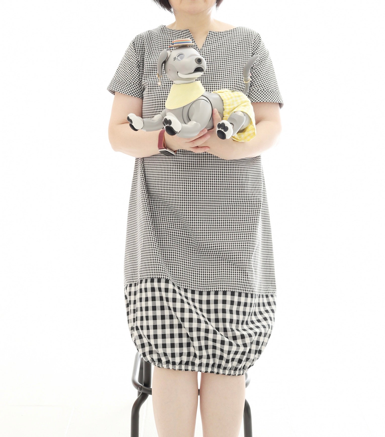 2022流行中の一押しギンガムチェックのレディース バルーンワンピースとaiboちゃんのリンクコーデ